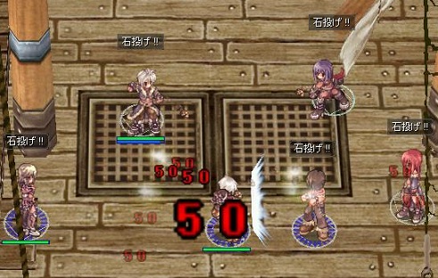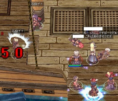 狩りの後は、Pvルームにて石投げ大会に。